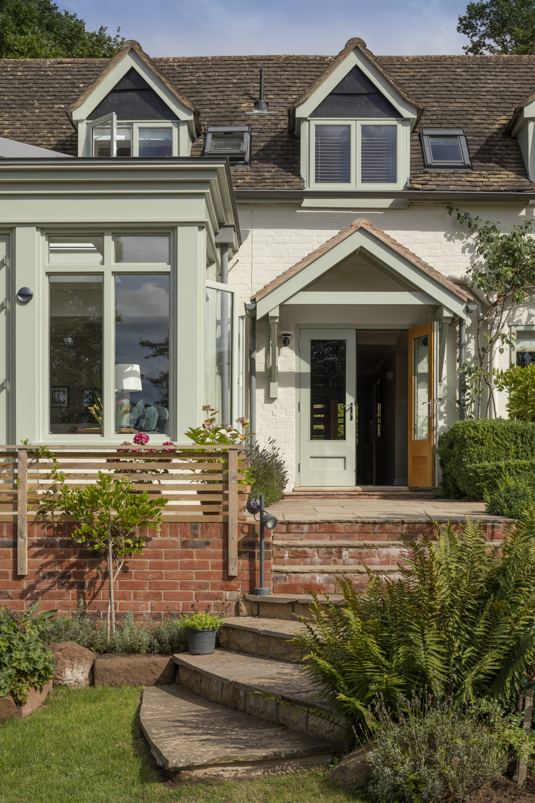 A pitched roof cottage set in a green and leafy garden surroundings. On the left of the cottage is a delicate timber and glazing extension. Sensitively added and in keeping with the cottage character of the house. Communion Architects, Hereford.A pitched roof cottage set in a green and leafy garden surroundings. On the left of the cottage is a delicate timber and glazing extension. Sensitively added and in keeping with the cottage character of the house. Communion Architects, Hereford.
